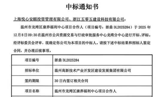 岁末收官之际,悦心健康康养业务开拓再传捷报,成功中标 “温州市龙湾区康养福利中心项目合作人”。此次中标不仅是对公司综合实力和品牌声誉的肯定,更是公司战略布局落地、深化区域市场拓展的标志性成果。标志着悦心健康在温州市的康养服务版图再添新成员,公司康养产业布局长三角又落重要一子。